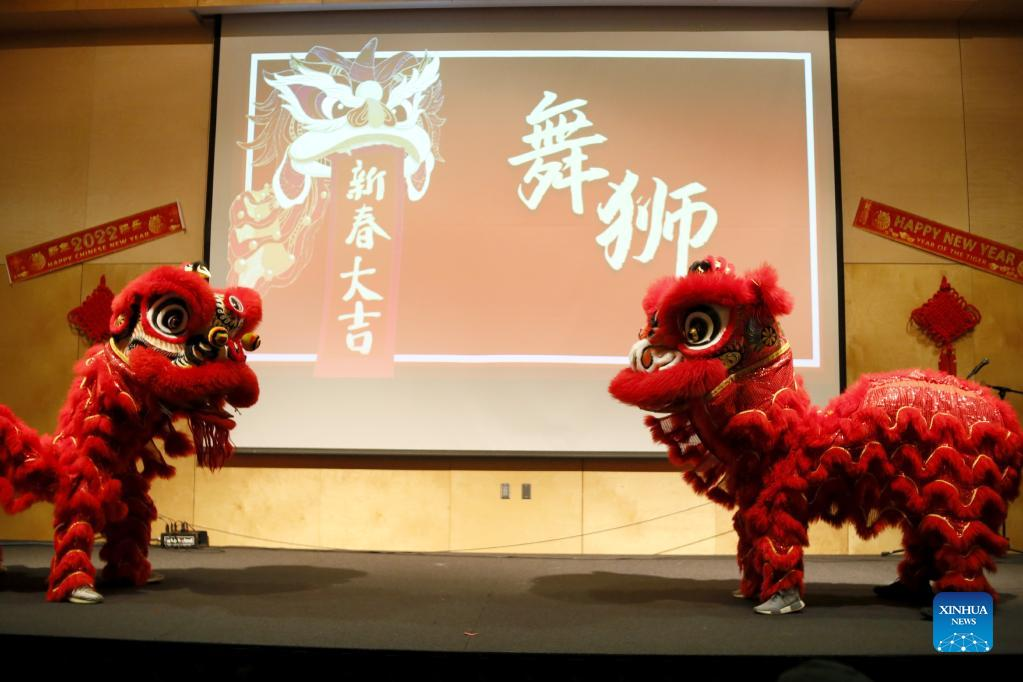 A lion dance group performs during Lantern Festival Gala held at Tulane University, New Orleans, Louisiana, the United States, on Feb. 12, 2022. The celebration is organized by Tulane University Chinese Students and Scholars Association with the active participation of various local Chinese communities. (Photo by Lan Wei/Xinhua)