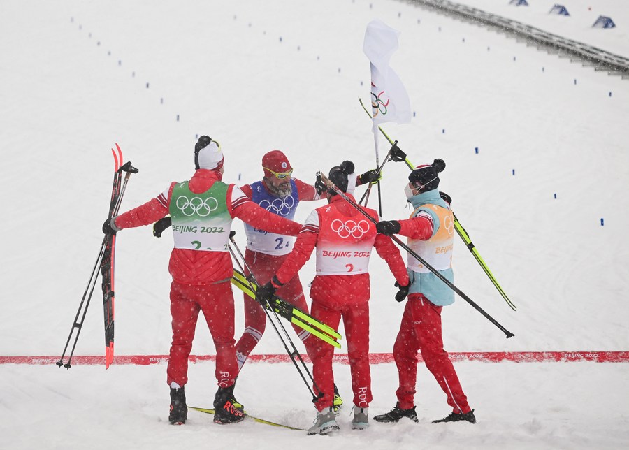 Athletes of ROC celebrate after the cross-country skiing men's 4x10 km relay of the Beijing Winter Olympics. (Xinhua/Mu Yu)