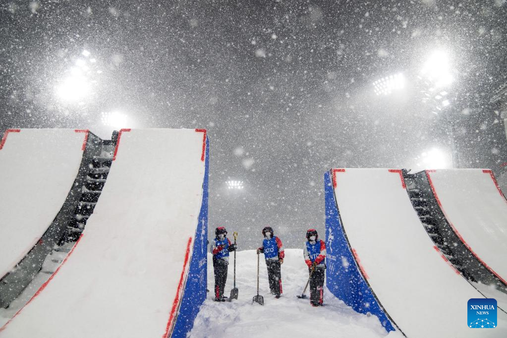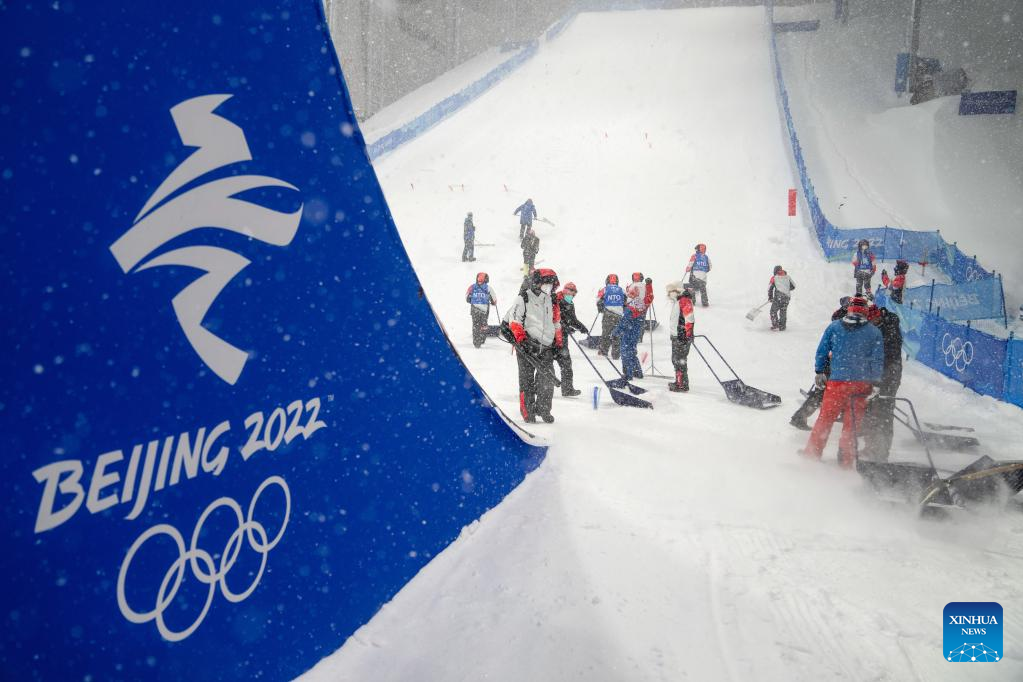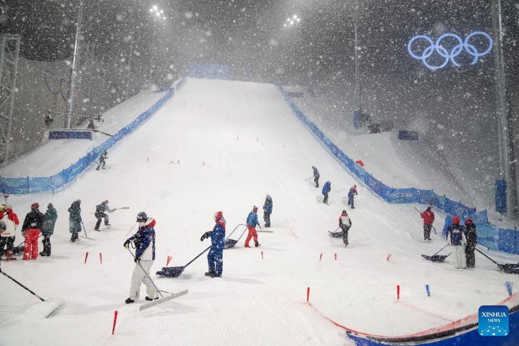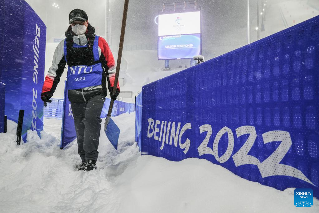 Staff members clear snow at Genting Snow Park in Zhangjiakou, north China's Hebei Province, Feb. 13, 2022. The freestyle skiing women's aerials qualification, originally scheduled to start on Sunday, has been postponed due to heavy snowfall. (Xinhua/Fei Maohua)