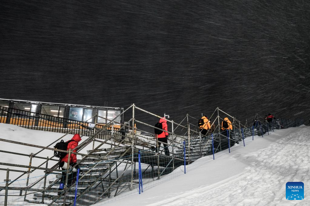 Reporters leave the the venue at Genting Snow Park in Zhangjiakou, north China's Hebei Province, Feb. 13, 2022. The freestyle skiing women's aerials qualification, originally scheduled to start on Sunday, has been postponed due to heavy snowfall. (Xinhua/Xu Chang)