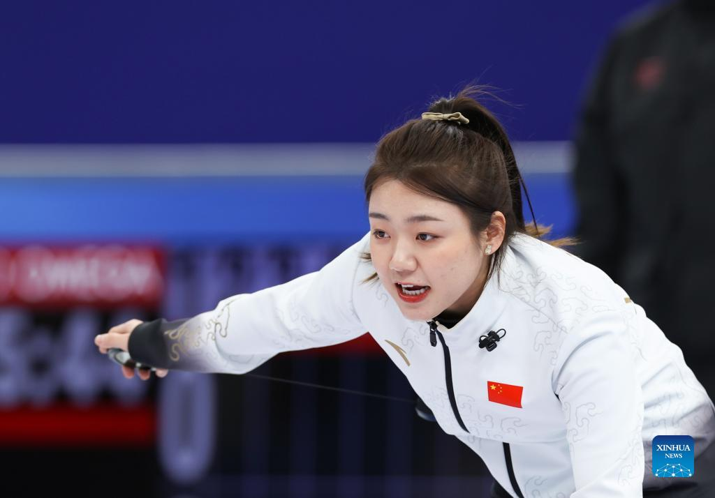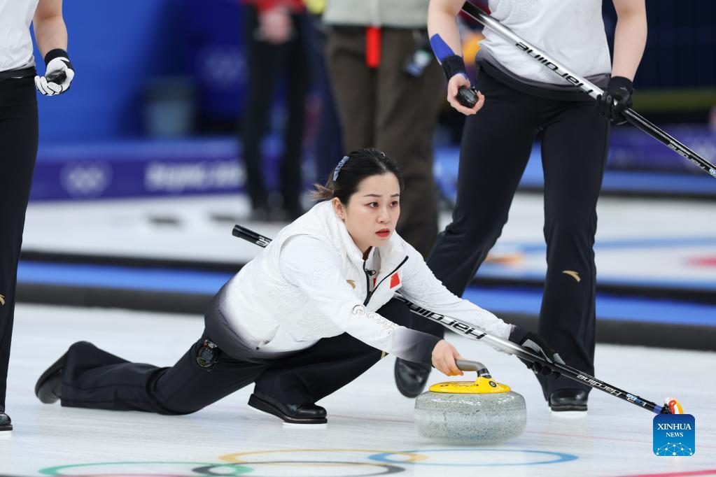 Han Yu of China competes during the Curling Women's Round Robin Session 6 of the Beijing 2022 Winter Olympics between South Korea and China at the National Aquatics Centre in Beijing, capital of China, Feb. 13, 2022. (Xinhua/Wang Jingqiang)