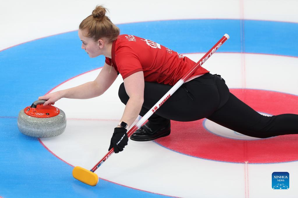 Mathilde Halse of Denmark competes during the curling women's round robin session 6 of Beijing 2022 Winter Olympics between Great Britain and Denmark at National Aquatics Centre in Beijing, capital of China, Feb. 13, 2022. (Xinhua/Liu Xu)