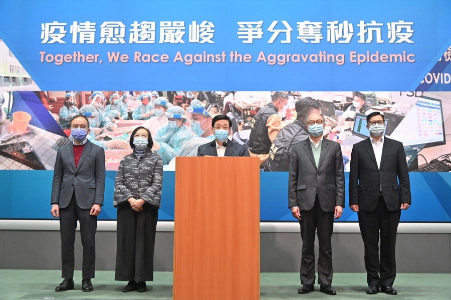 Chief Secretary for Administration John Lee (center) meets the media with Secretary for Transport and Housing Frank Chan Fan (second right), Secretary for Food and Health Sophia Chan (second left), Secretary for Constitutional and Mainland Affairs Erick Tsang Kwok-wai (first left), and Secretary for Security Tang Ping-keung (first right) at the Central Government Offices in Hong Kong, south China, Feb. 12, 2022. (Information Services Department of the HKSAR Government/Handout via Xinhua)