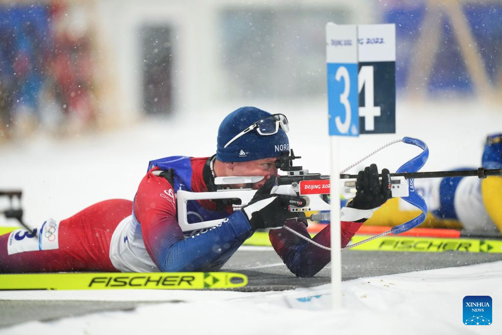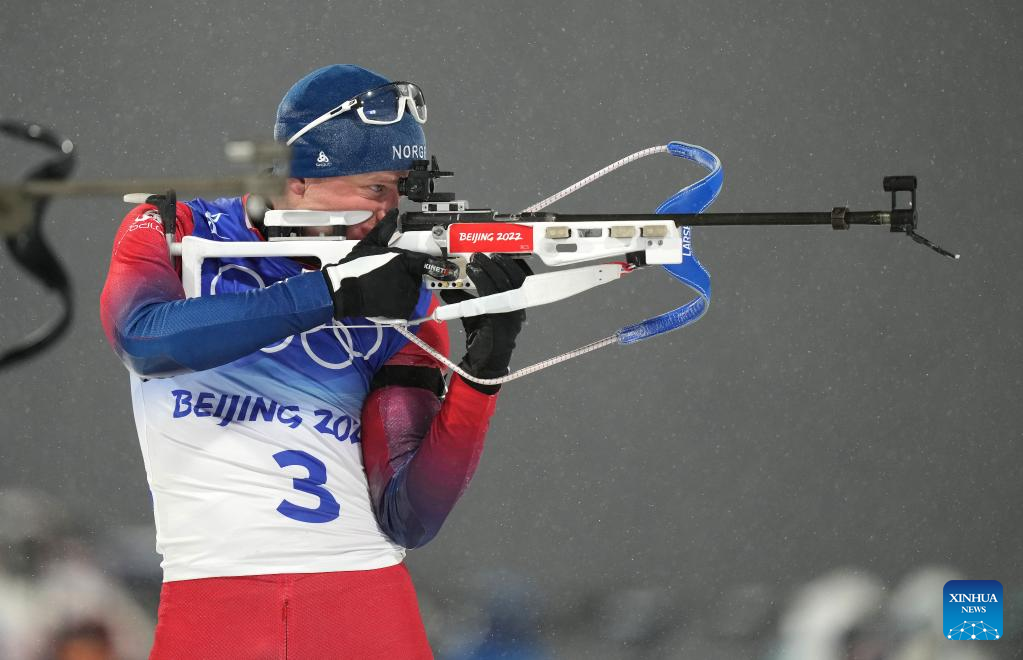 Tarjei Boe of Norway competes during biathlon men's 12.5km pursuit at National Biathlon Centre in Zhangjiakou, north China's Hebei Province, Feb. 13, 2022. (Xinhua/Zhan Yan)