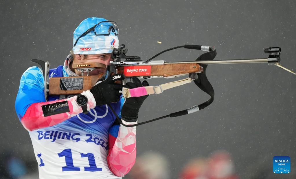 Eduard Latypov of ROC competes during biathlon men's 12.5km pursuit at National Biathlon Centre in Zhangjiakou, north China's Hebei Province, Feb. 13, 2022. (Xinhua/Zhan Yan)