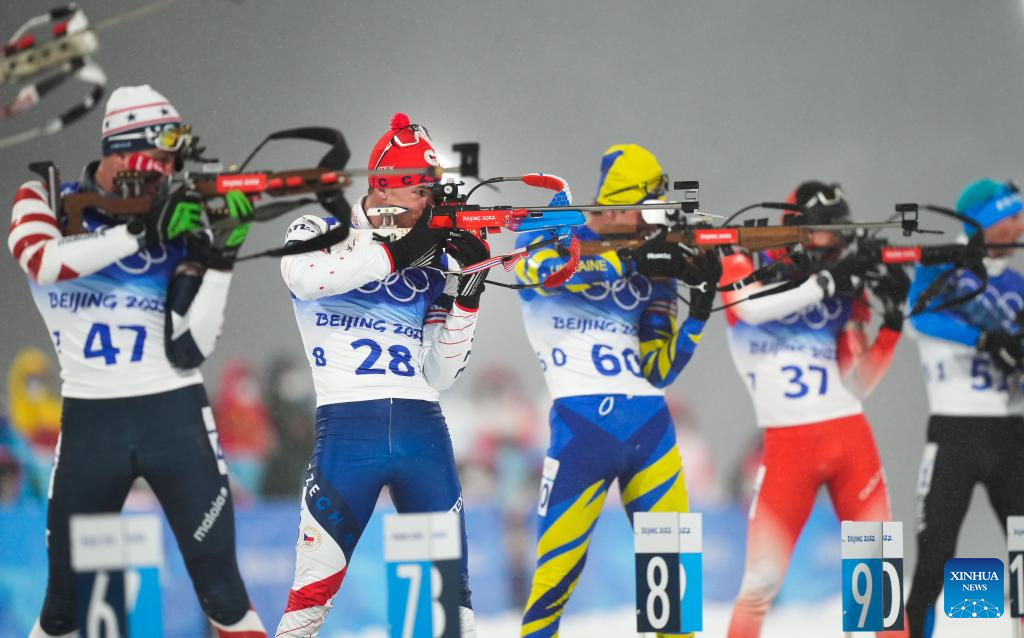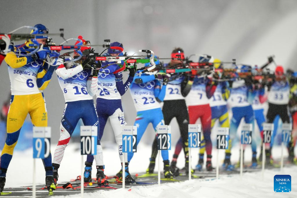 Athletes compete during biathlon men's 12.5km pursuit at National Biathlon Centre in Zhangjiakou, north China's Hebei Province, Feb. 13, 2022. (Xinhua/Zhan Yan)