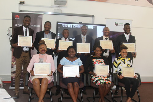 Students pose for a photo with their certificates of completion at the 2020 Huawei Seeds for the Future Program graduation ceremony in Harare, Zimbabwe, on Sept. 11, 2020. (Xinhua/Tafara Mugwara)