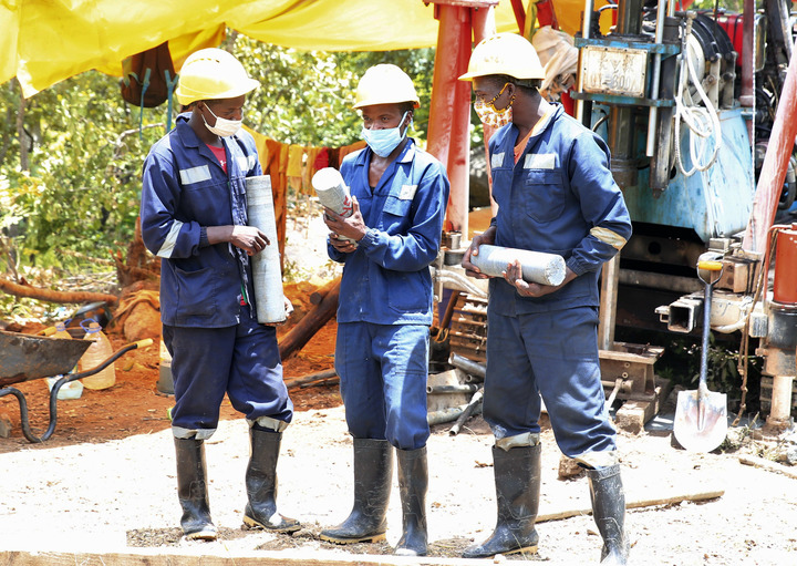 Robert Machinga (C) and his colleagues check samples of granite stones at Shanghai Haoyun mine in Mutoko, Mashonaland East Province, Zimbabwe, on Jan. 21, 2022. (Photo by Shaun Jusa/Xinhua)
