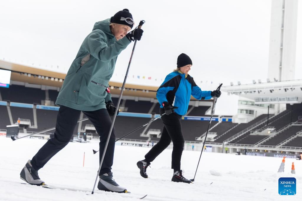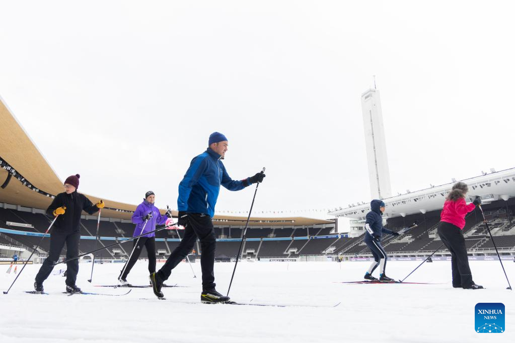 People ski at the Olympic Stadium during the Helsinki Ski Weeks in Helsinki, Finland, Feb. 13, 2022. During the Helsinki Ski Weeks, people have free access to the 1.1-km-long track for one hour at the iconic Olympic Stadium, which hosted the 1952 Summer Olympic games. (Photo by Matti Matikainen/Xinhua)