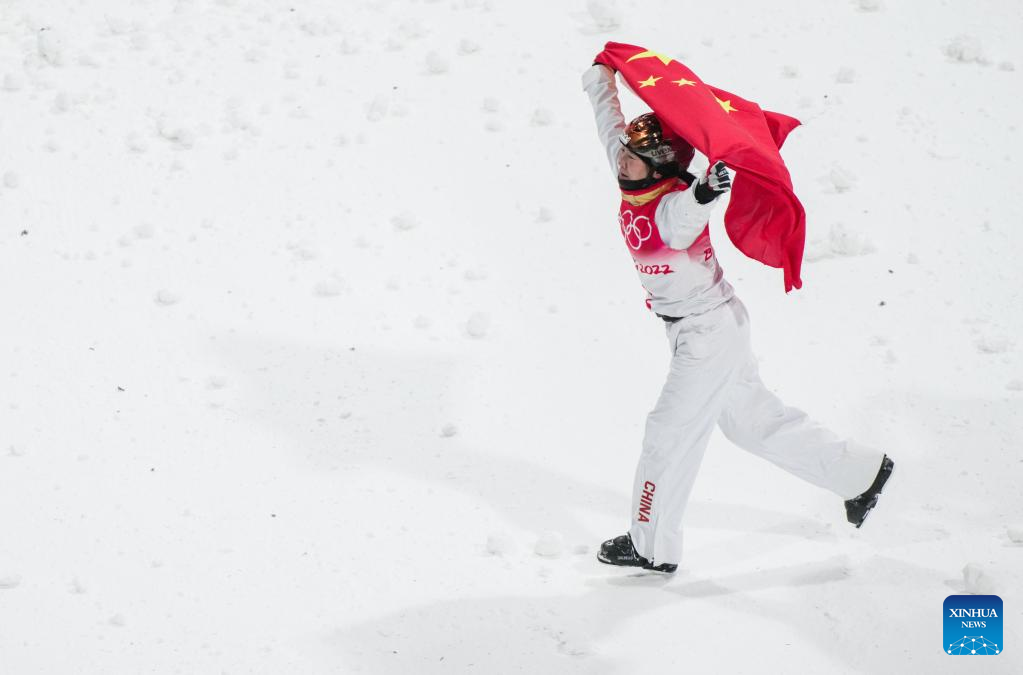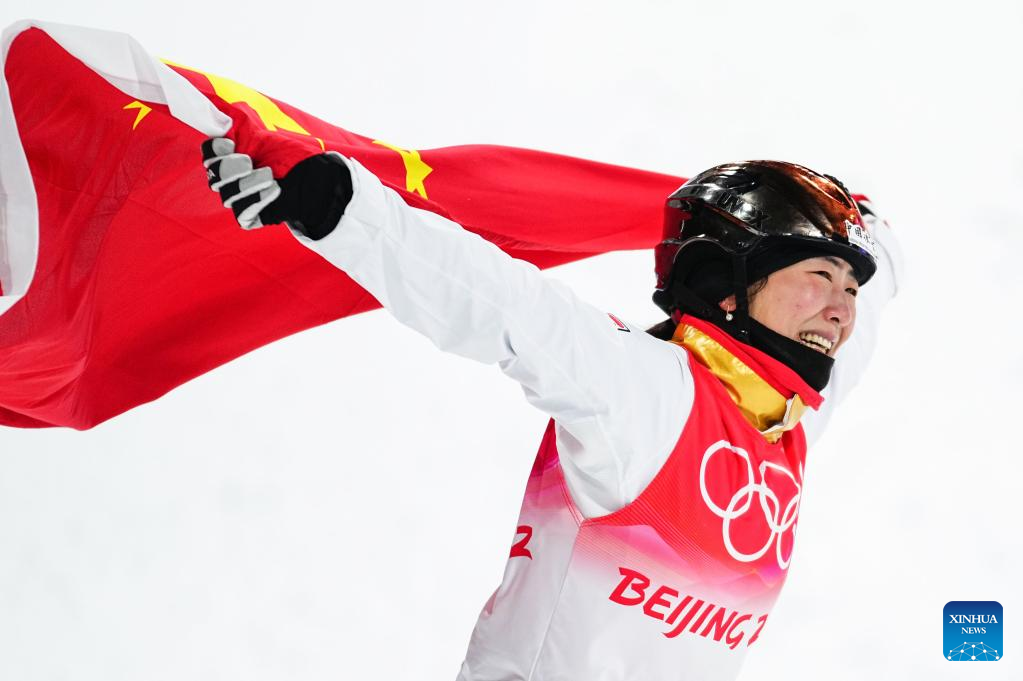 Xu Mengtao of China celebrates after winning the gold medal in the freestyle skiing women's aerials final of the Beijing 2022 Winter Olympics at Genting Snow Park in Zhangjiakou, north China's Hebei Province, Feb. 14, 2022. (Xinhua/Hu Huhu)