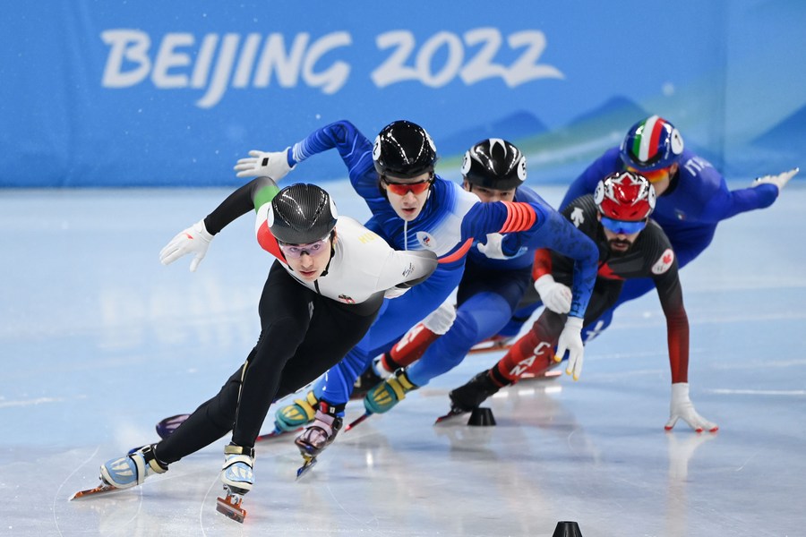 Shaoang Liu (front) of Hungary competes during the men's 500m short track speed skating final at the Capital Indoor Stadium in Beijing, capital of China, Feb. 13, 2022. (Xinhua/Huang Zongzhi)