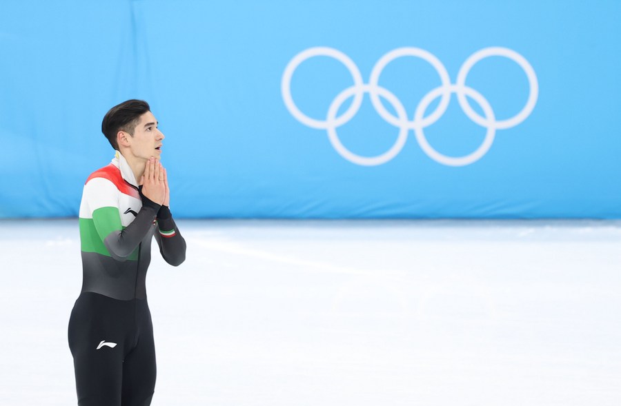 Shaoang Liu of Hungary reacts after the men's 500m short track speed skating final at the Capital Indoor Stadium in Beijing, capital of China, Feb. 13, 2022. (Xinhua/Yang Lei)
