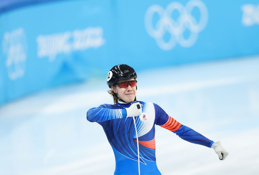 Konstantin Ivliev of ROC reacts after the men's 500m short track speed skating final at the Capital Indoor Stadium in Beijing, capital of China, Feb. 13, 2022. (Xinhua/Lan Hongguang)