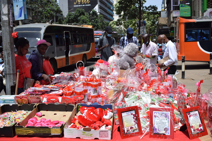 The downtown section of Nairobi is a burst of the classic red color as traders strew their wares on every available empty space, eager to profit from Valentine's Day sales.