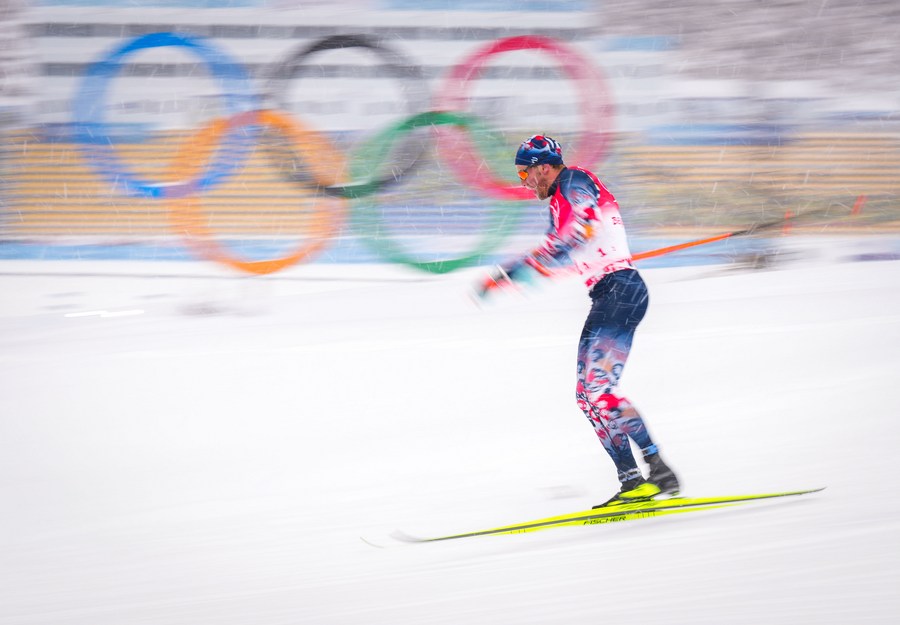Sergey Ustiugov of ROC competes during the cross-country skiing men's 4x10 km relay of the Beijing Winter Olympics at the National Cross-Country Skiing Centre in Zhangjiakou, north China's Hebei Province, Feb. 13, 2022. (Xinhua/Deng Hua)