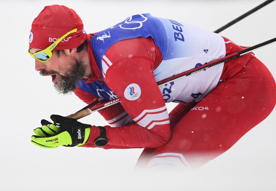 Denis Spitsov of ROC competes during the cross-country skiing men's 4x10 km relay of the Beijing Winter Olympics at the National Cross-Country Skiing Centre in Zhangjiakou, north China's Hebei Province, Feb. 13, 2022. (Xinhua/Mu Yu)