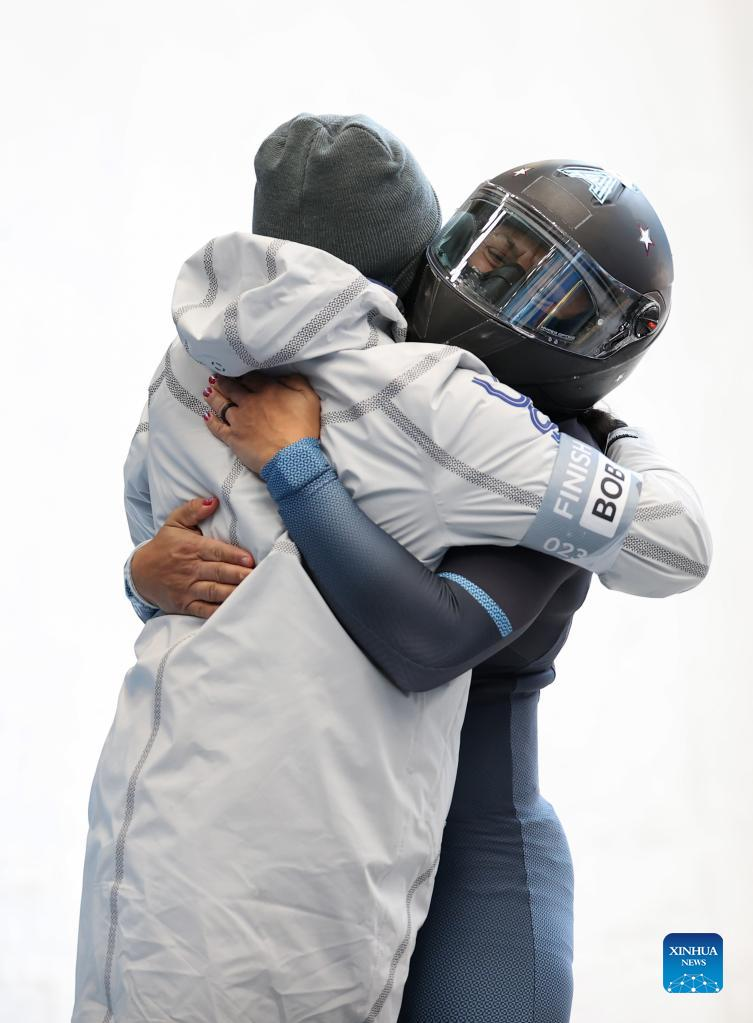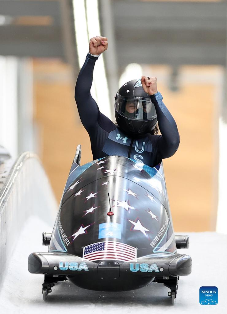Elana Meyers Taylor (R) of the United States celebrates after the bobsleigh women's monobob heat at National Sliding Centre in Yanqing District, Beijing, capital of China, Feb. 14, 2022. (Xinhua/Yao Jianfeng)