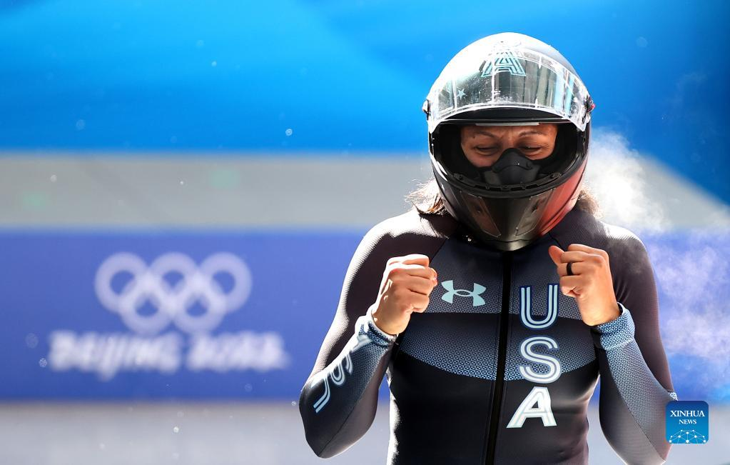 Elana Meyers Taylor of the United States reacts after the bobsleigh women's monobob heat at National Sliding Centre in Yanqing District, Beijing, capital of China, Feb. 14, 2022. (Xinhua/Yao Jianfeng)