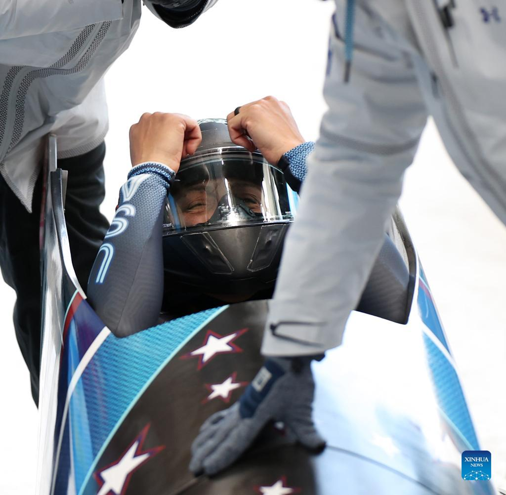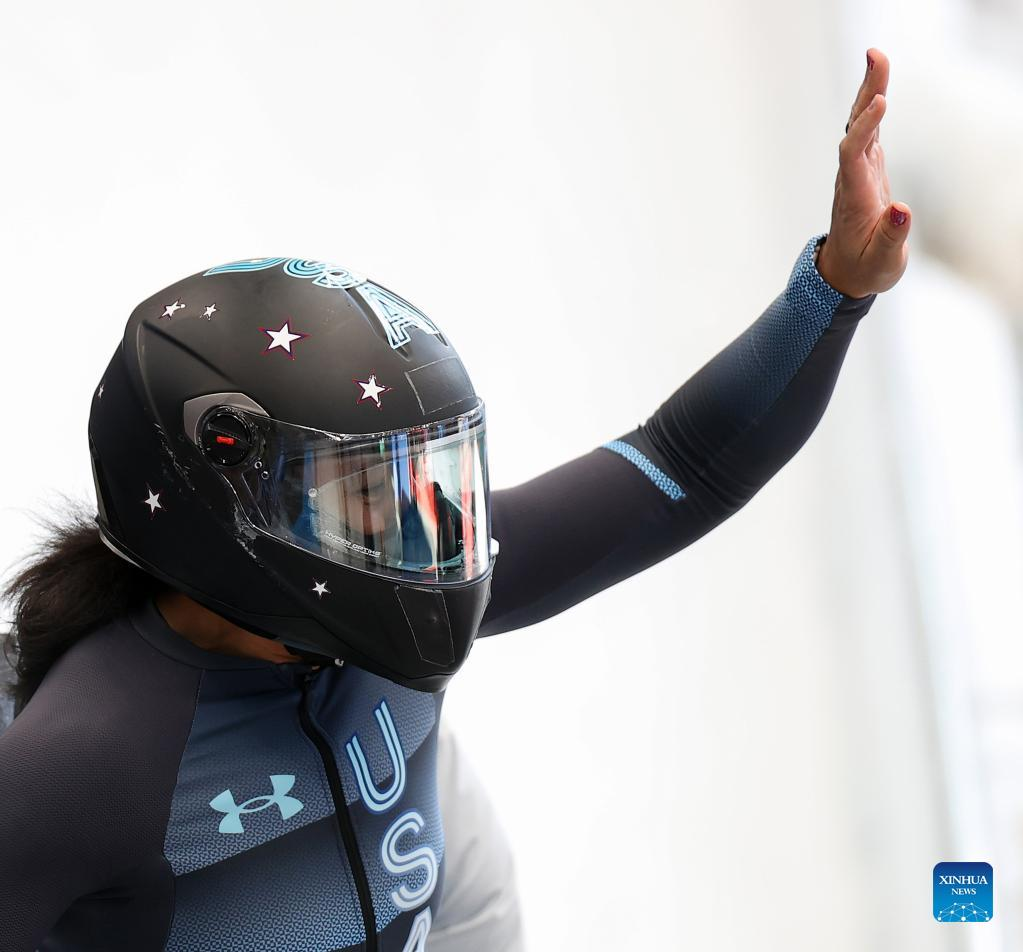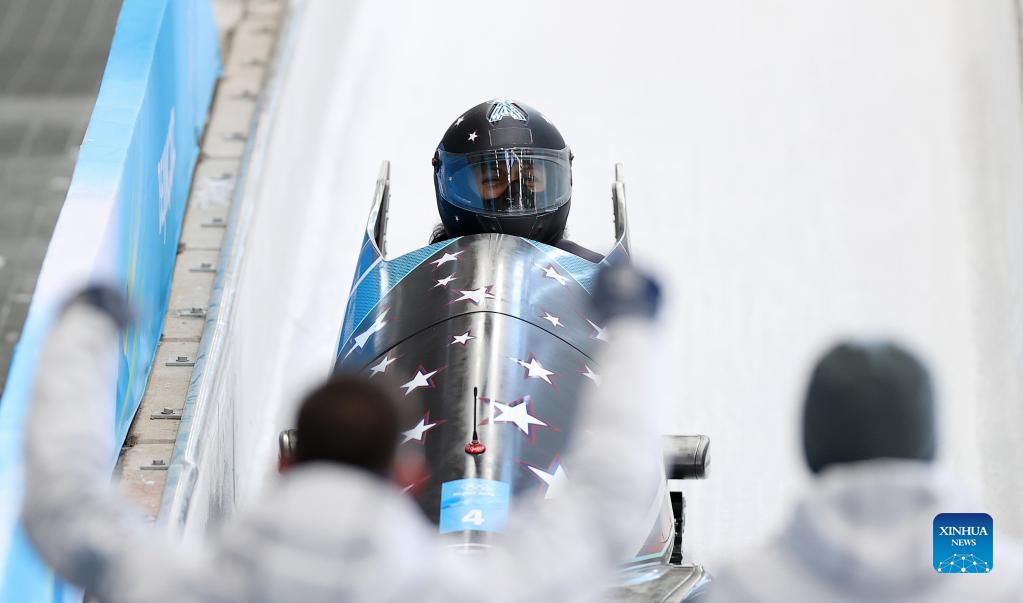 Elana Meyers Taylor (rear) of the United States reacts after the bobsleigh women's monobob heat at National Sliding Centre in Yanqing District, Beijing, capital of China, Feb. 14, 2022. (Xinhua/Yao Jianfeng)