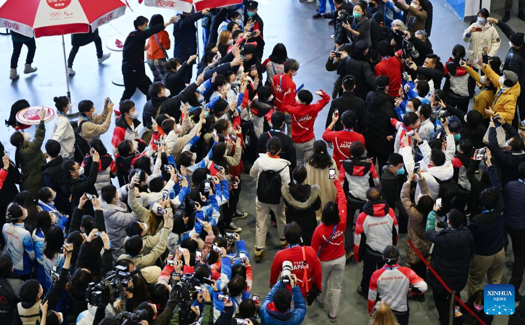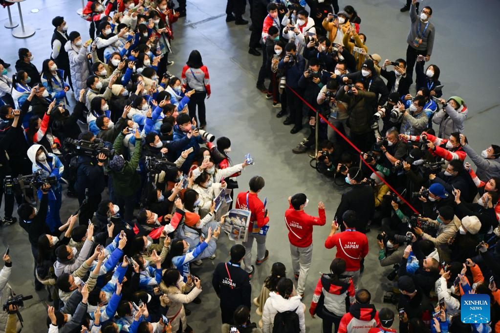 Figure skating athlete Hanyu Yuzuru of Japan goes to attend a press conference at the Main Media Center for Beijing 2022 Winter Olympics in Beijing, capital of China, Feb. 14, 2022. (Xinhua/Li Ga)