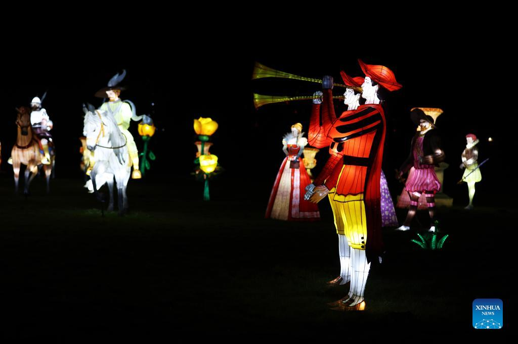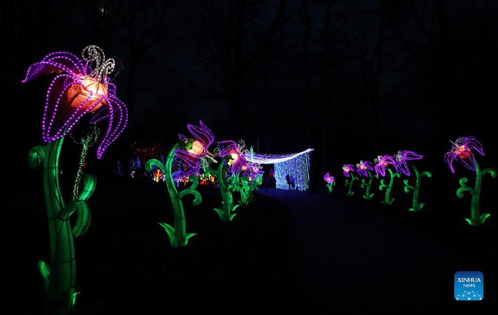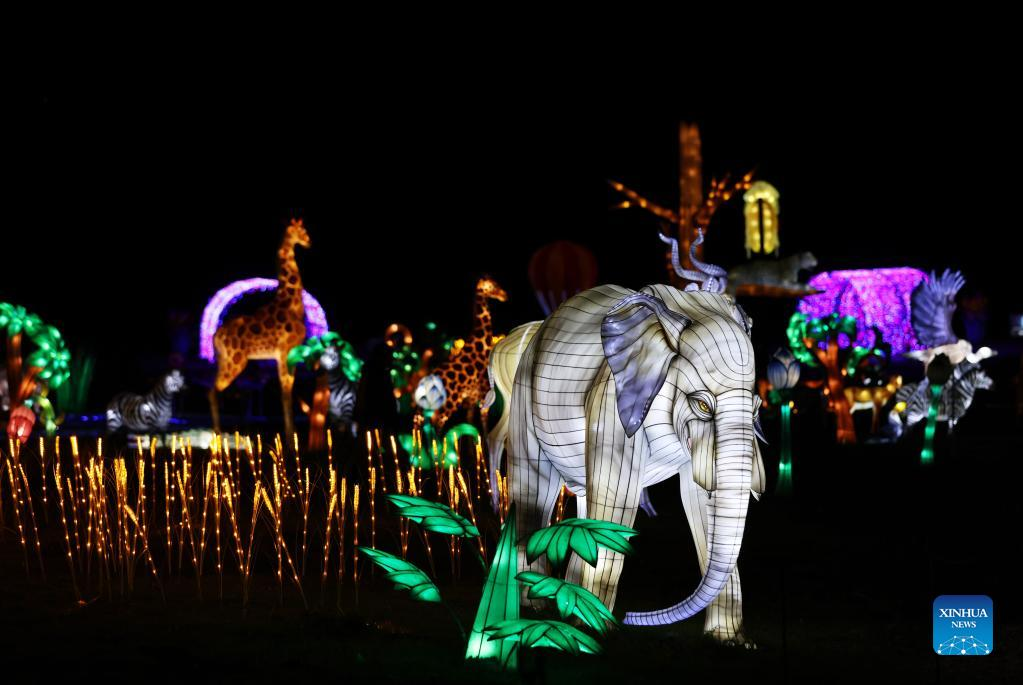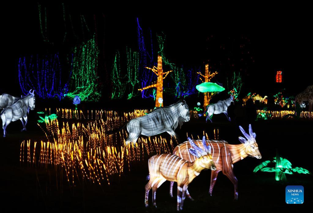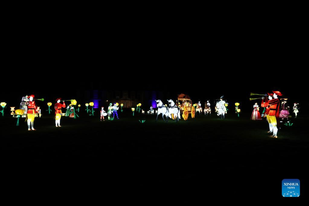 Illuminated sculptures are on display during a light festival at Thoiry zoo near Paris, France, Feb. 13, 2022. The festival runs till March 6, 2022. (Xinhua/Gao Jing)