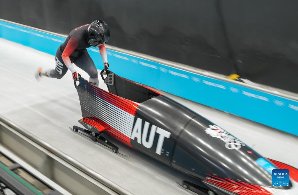 Katrin Beierl of Austria competes during the bobsleigh women's monobob competition of Beijing 2022 Winter Olympics at National Sliding Centre in Yanqing District, Beijing, capital of China, Feb. 14, 2022. (Xinhua/Sun Fei)