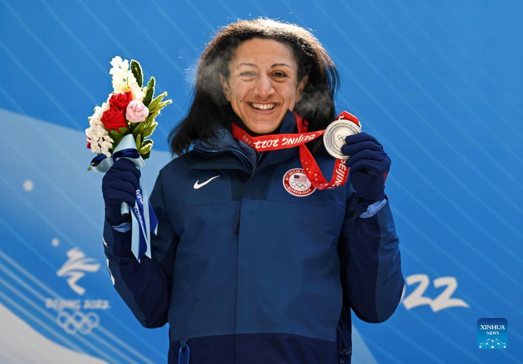 Silver medalist Elana Meyers Taylor of the United States attends the awarding ceremony after the bobsleigh women's monobob competition of Beijing 2022 Winter Olympics at National Sliding Centre in Yanqing District, Beijing, capital of China, Feb. 14, 2022. (Xinhua/He Changshan)