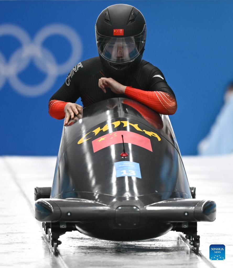 Ying Qing of China competes during the bobsleigh women's monobob competition of Beijing 2022 Winter Olympics at National Sliding Centre in Yanqing District, Beijing, capital of China, Feb. 14, 2022. (Xinhua/Sun Fei)