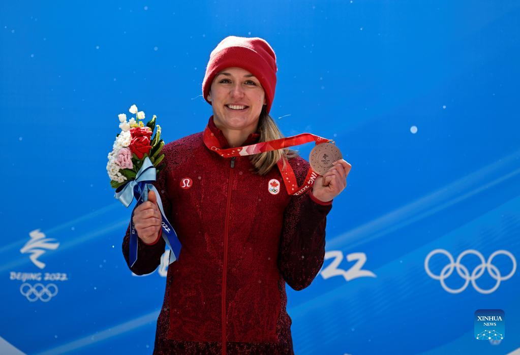 Bronze medalist Christine de Bruin of Canada attends the awarding ceremony after the bobsleigh women's monobob competition of Beijing 2022 Winter Olympics at National Sliding Centre in Yanqing District, Beijing, capital of China, Feb. 14, 2022. (Xinhua/He Changshan)