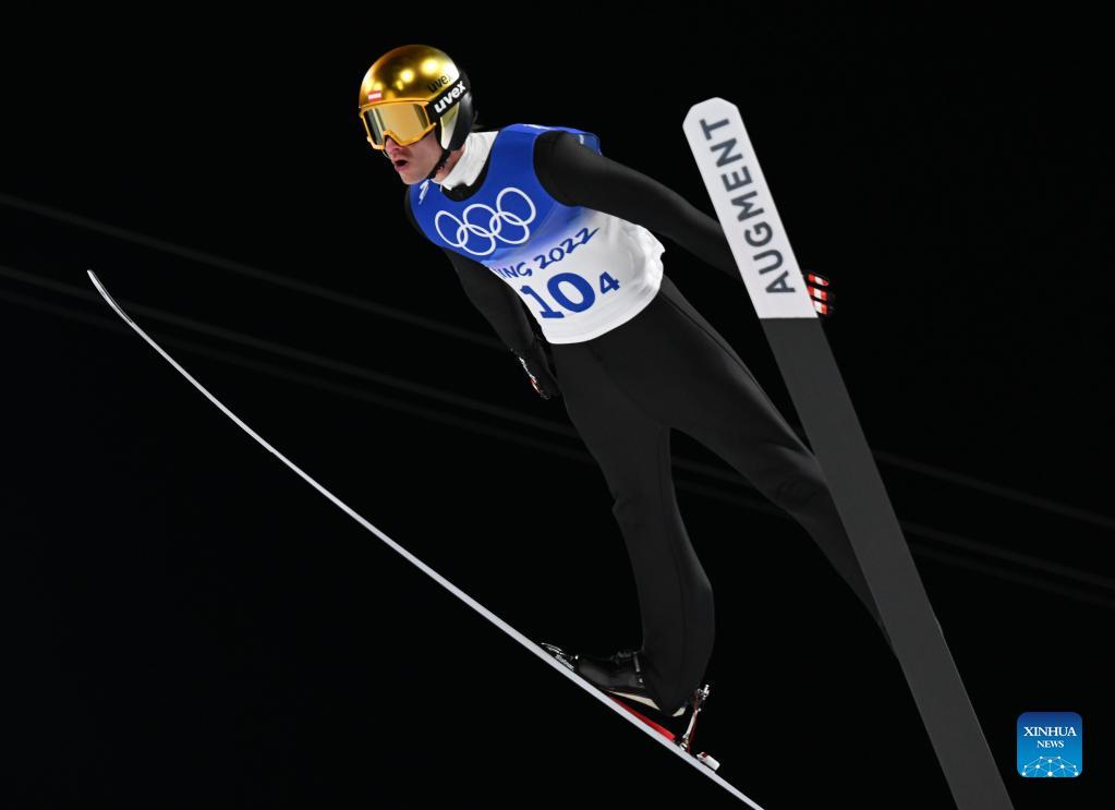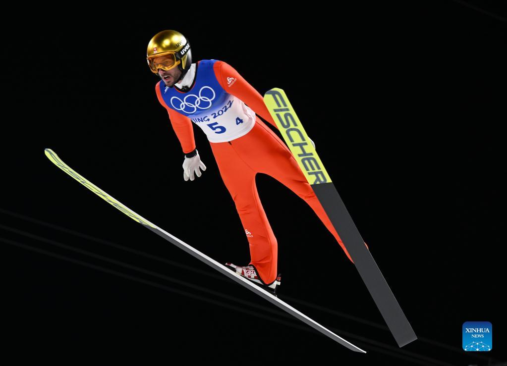 Manuel Fettner of Austria competes during ski jumping men's team at the National Ski Jumping Centre in Zhangjiakou, north China's Hebei Province, Feb. 14, 2022. (Xinhua/Feng Kaihua)