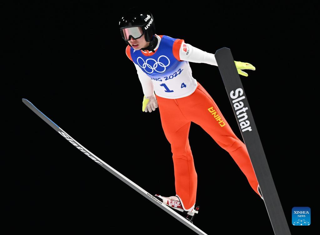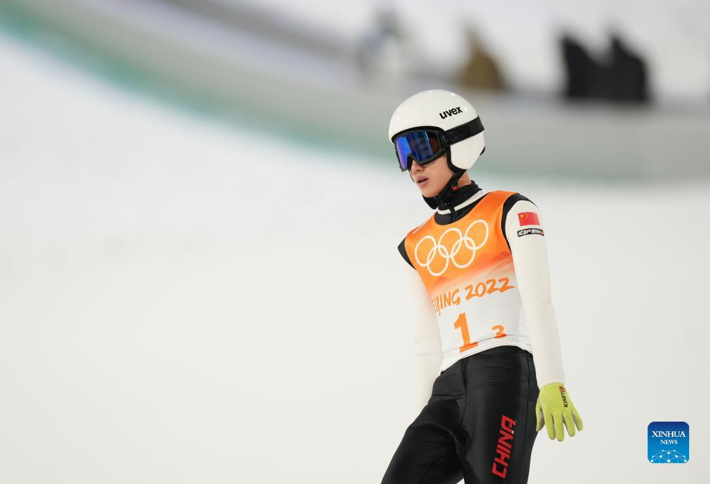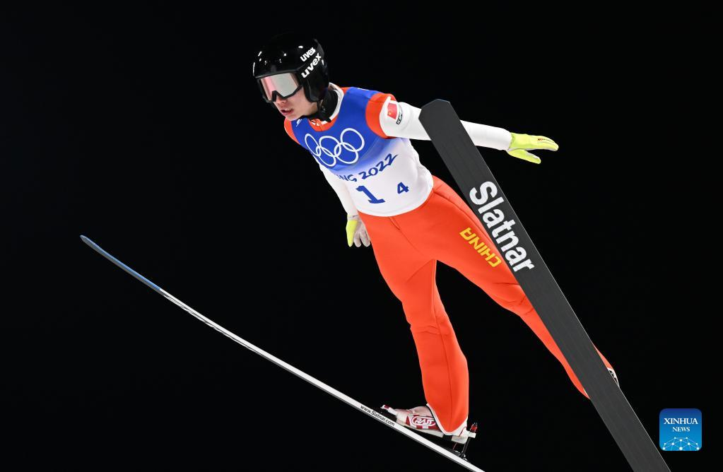 Zhou Xiaoyang of China competes during ski jumping men's team at the National Ski Jumping Centre in Zhangjiakou, north China's Hebei Province, Feb. 14, 2022. (Xinhua/Jiang Kehong)