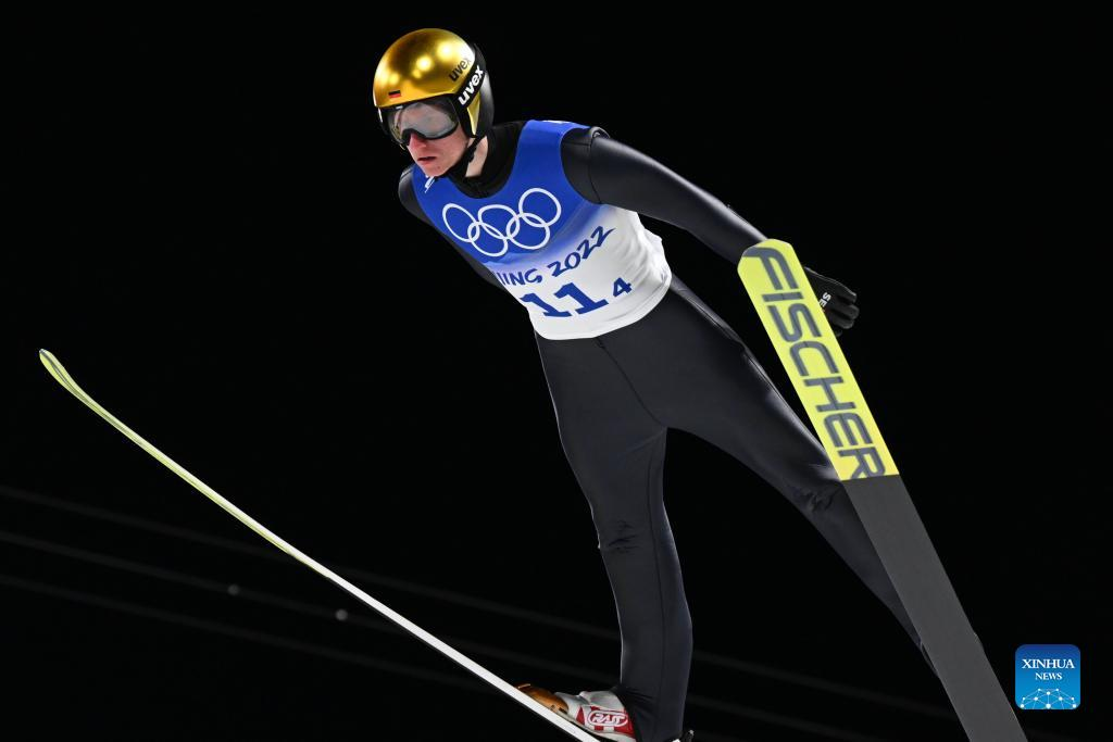 Karl Geiger of Germany competes during ski jumping men's team at the National Ski Jumping Centre in Zhangjiakou, north China's Hebei Province, Feb. 14, 2022. (Xinhua/Feng Kaihua)