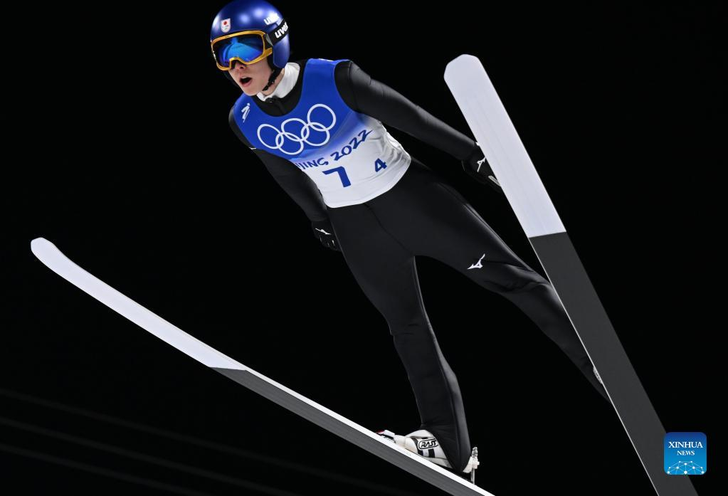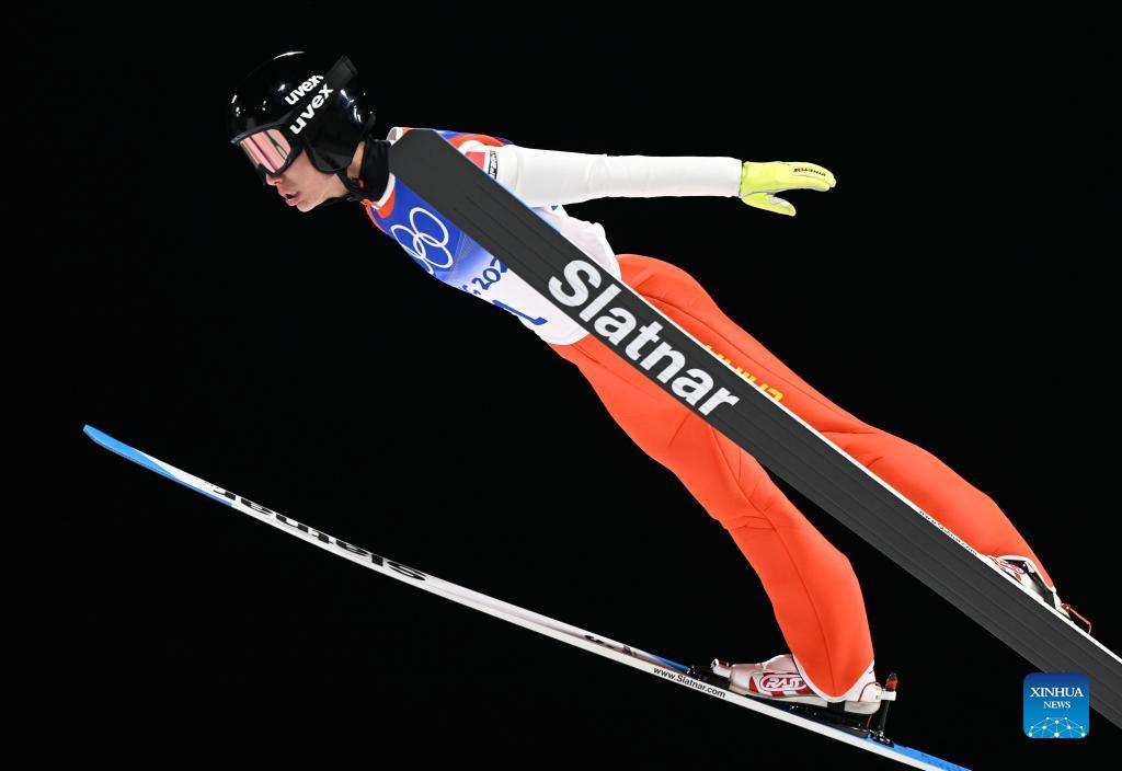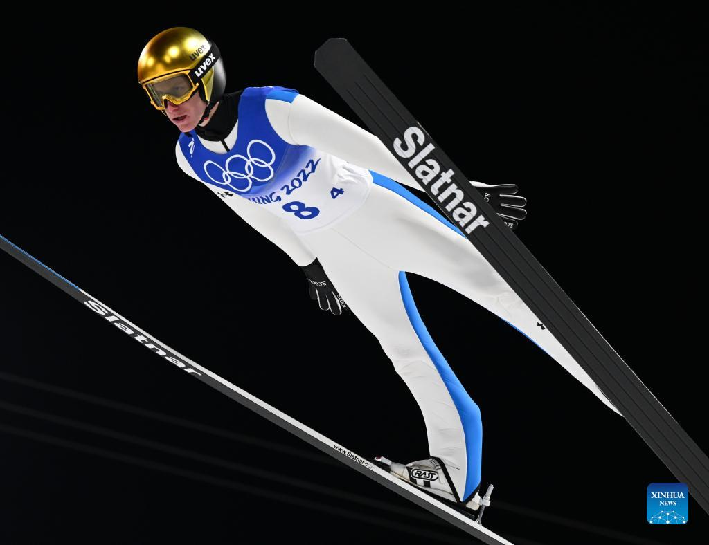 Peter Prevc of Slovenia competes during ski jumping men's team at the National Ski Jumping Centre in Zhangjiakou, north China's Hebei Province, Feb. 14, 2022. (Xinhua/Feng Kaihua)