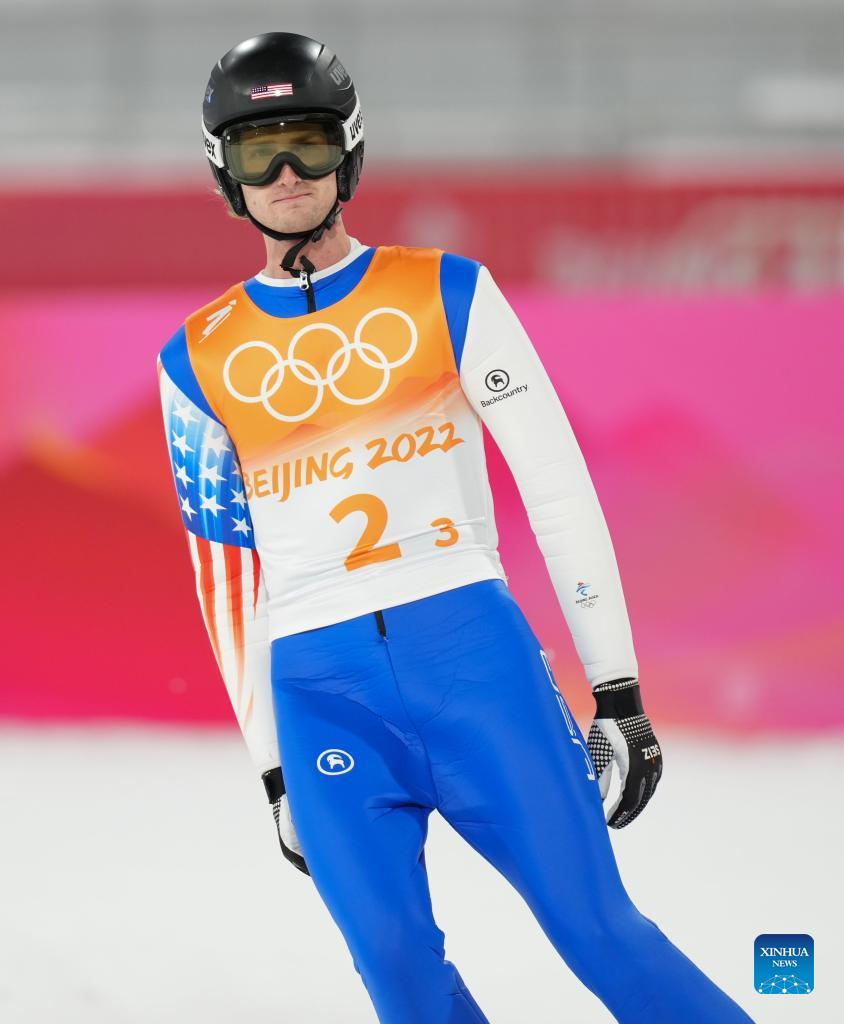 Kevin Bickner of the United States reacts during ski jumping men's team at the National Ski Jumping Centre in Zhangjiakou, north China's Hebei Province, Feb. 14, 2022. (Xinhua/Wang Song)