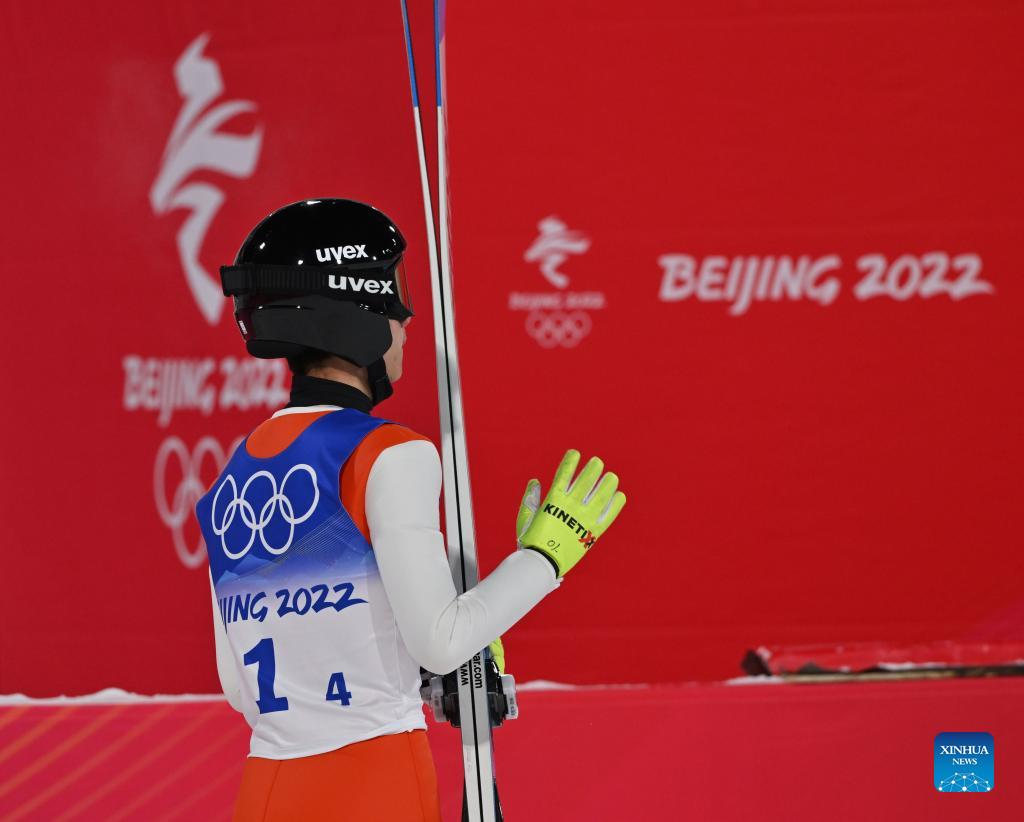 Zhou Xiaoyang of China reacts during ski jumping men's team at the National Ski Jumping Centre in Zhangjiakou, north China's Hebei Province, Feb. 14, 2022. (Xinhua/Jiang Kehong)