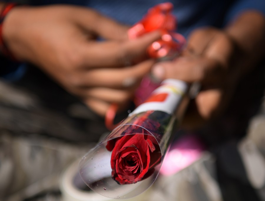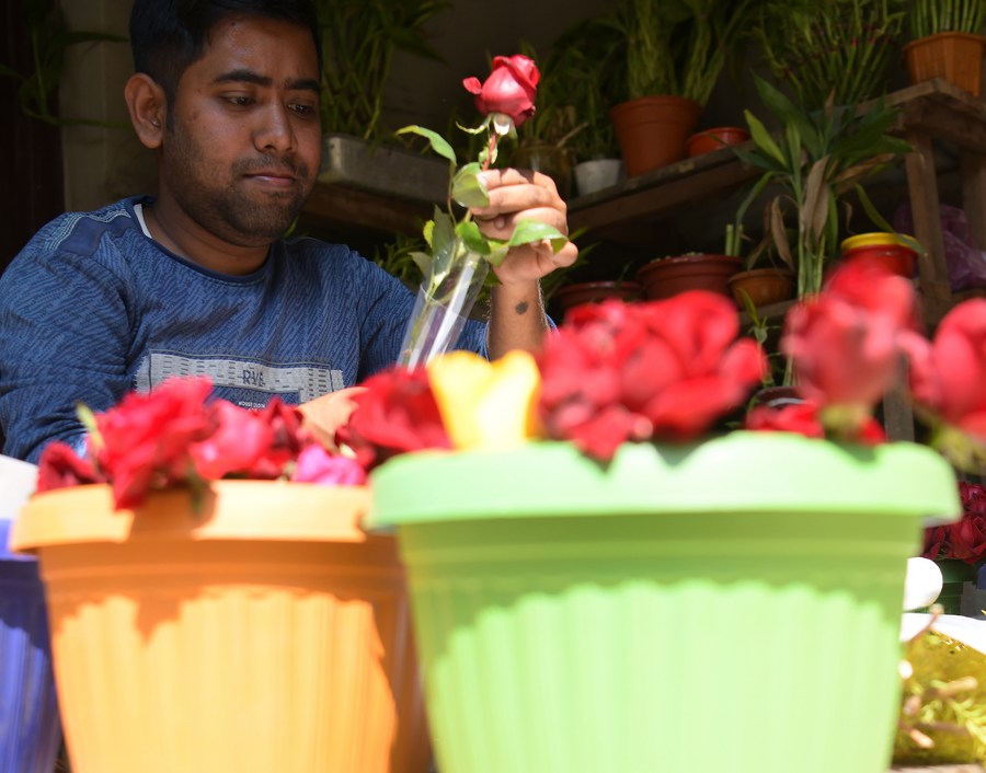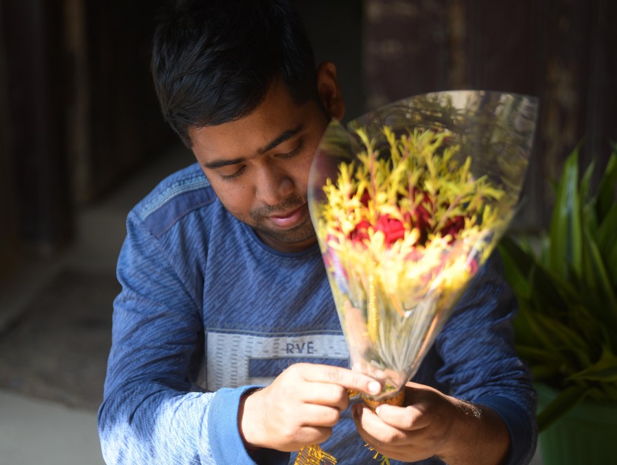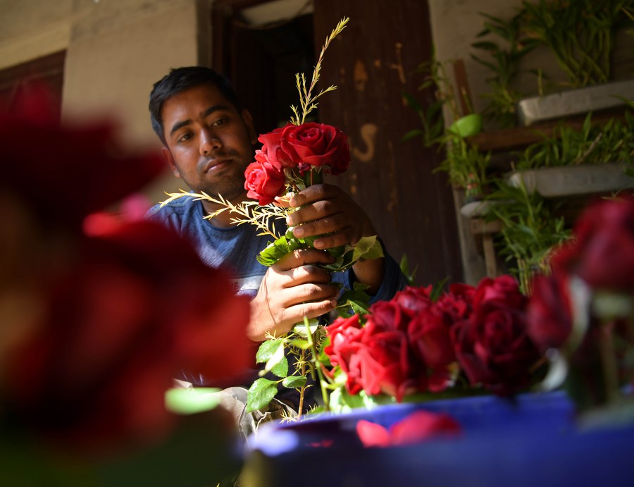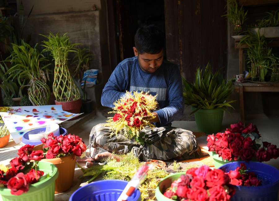 A florist makes bouquets of roses in his garden on the eve of Valentine's Day on the outskirts of Agartala, the capital city of India's northeastern state of Tripura, Feb. 13, 2022. (Str/Xinhua)