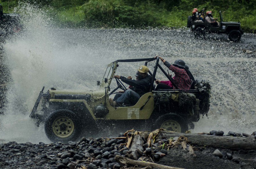 People ride rented jeep vehicles during lava tour near Mount Merapi in Yogyakarta, Indonesia, Feb. 13, 2022. (Photo by Supriyanto/Xinhua)