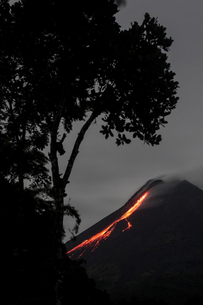 Photo taken on Feb. 13, 2022 shows volcanic materials being spewed from Mount Merapi seen from Turgo Purwobinangun village in Sleman, Yogyakarta, Indonesia. (Photo by Priyo Utomo/Xinhua) ■