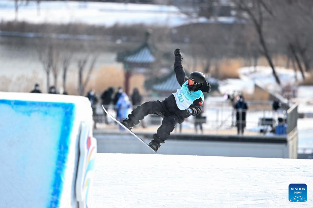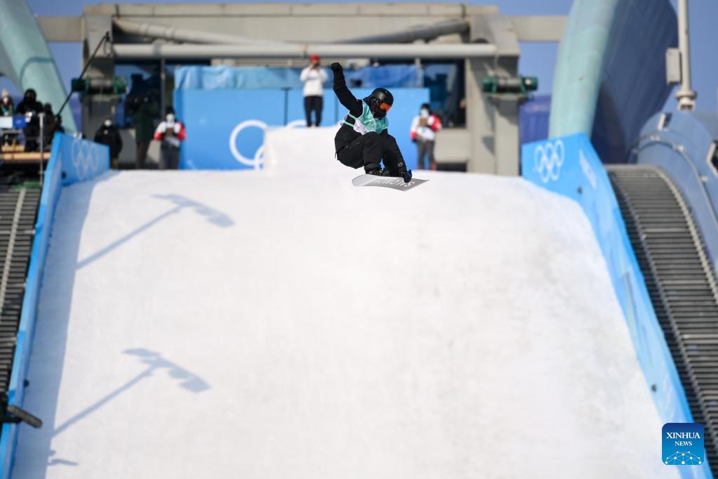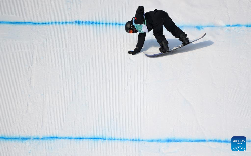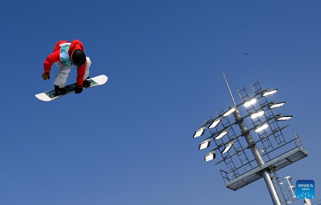 Rong Ge of China competes during women's snowboard big air final of Beijing 2022 Winter Olympics at Big Air Shougang in Beijing, capital of China, Feb. 15, 2022. (Xinhua/Xue Yuge)