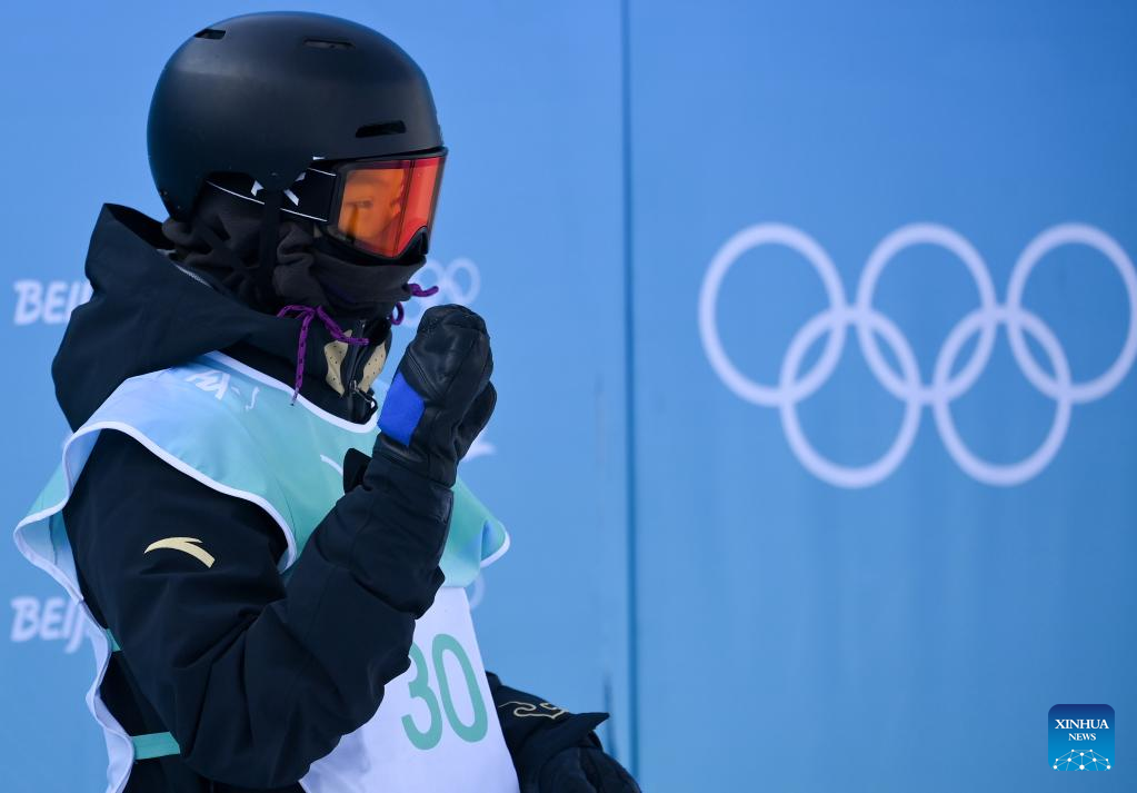 Rong Ge of China reacts during women's snowboard big air final of Beijing 2022 Winter Olympics at Big Air Shougang in Beijing, capital of China, Feb. 15, 2022. (Xinhua/Xue Yuge)