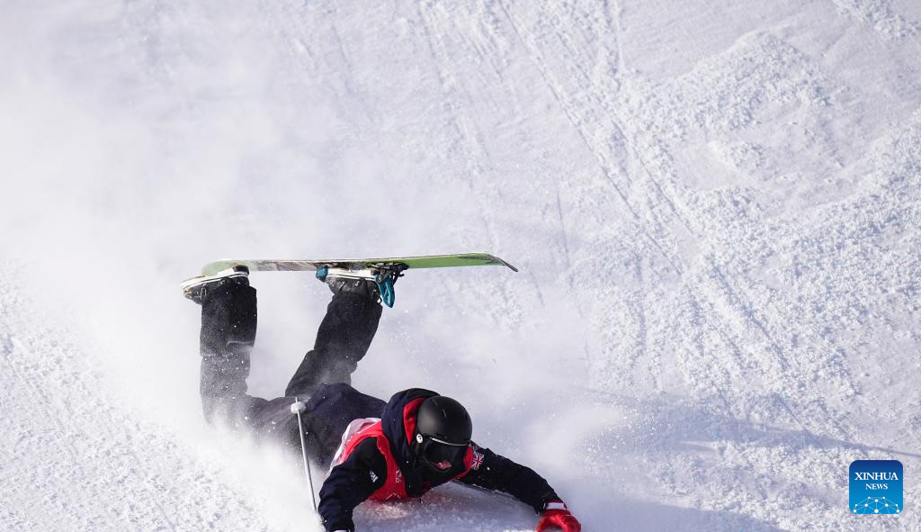 Rong Ge of China falls during women's snowboard big air final of Beijing 2022 Winter Olympics at Big Air Shougang in Beijing, capital of China, Feb. 15, 2022. (Xinhua/Xue Yuge)