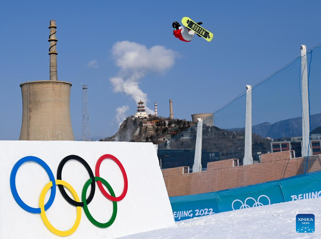 Jasmine Baird of Canada competes during women's snowboard big air final of Beijing 2022 Winter Olympics at Big Air Shougang in Beijing, capital of China, Feb. 15, 2022. (Xinhua/Li He)