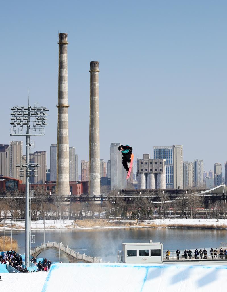 Su Yiming of China competes during the men's snowboard big air final of Beijing 2022 Winter Olympics at Big Air Shougang in Beijing, capital of China, Feb. 15, 2022. (Xinhua/Yang Lei)