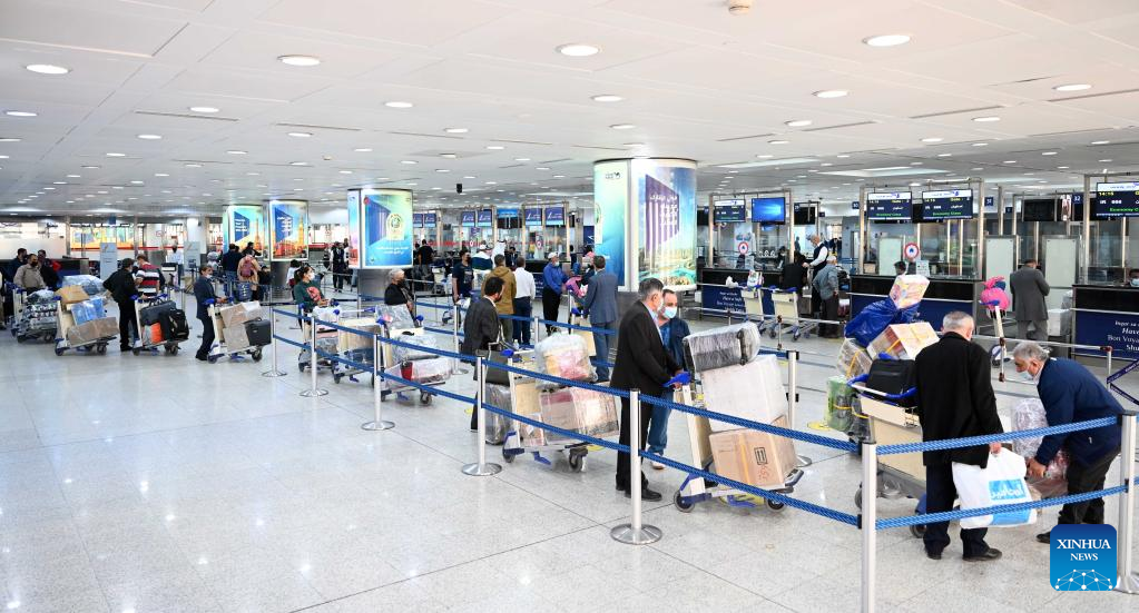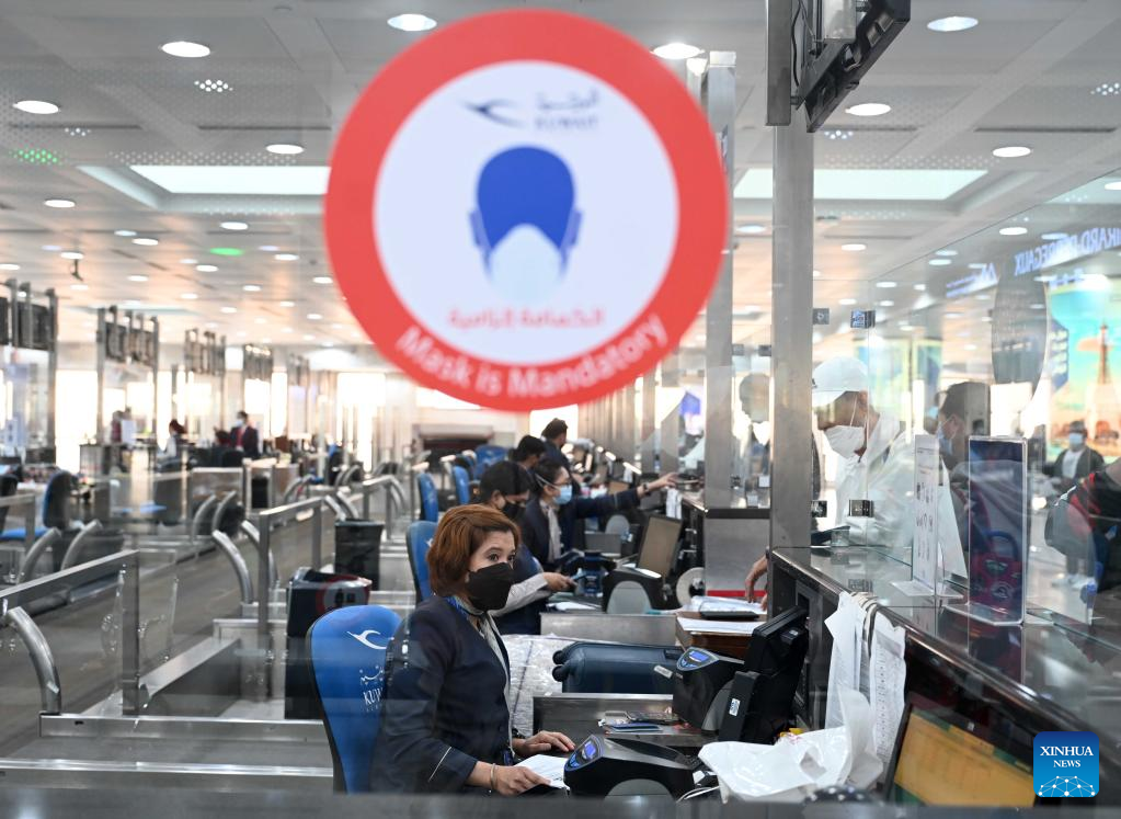 Passengers check in inside the departure hall of Kuwait International Airport in Farwaniya Governorate, Kuwait, Feb. 20, 2022. Kuwait decided to ease COVID-19 restrictions, the Kuwaiti government announced on Monday.