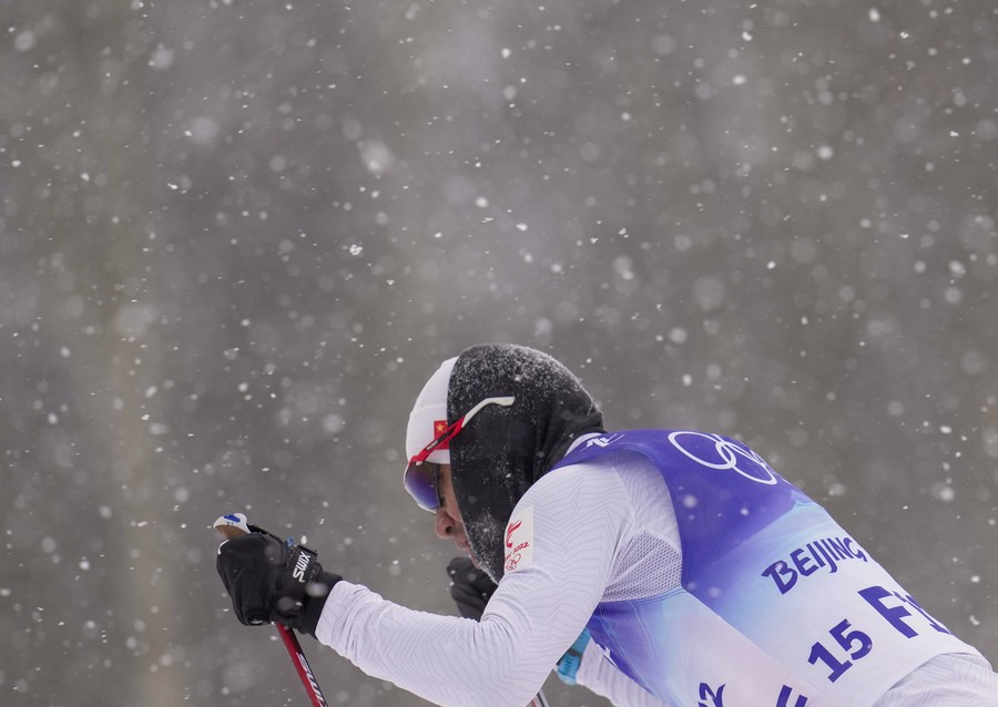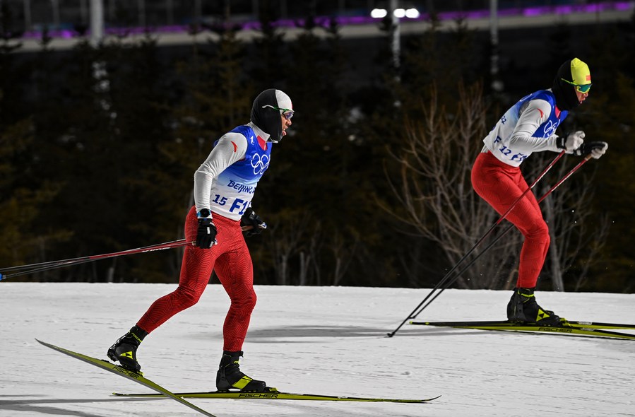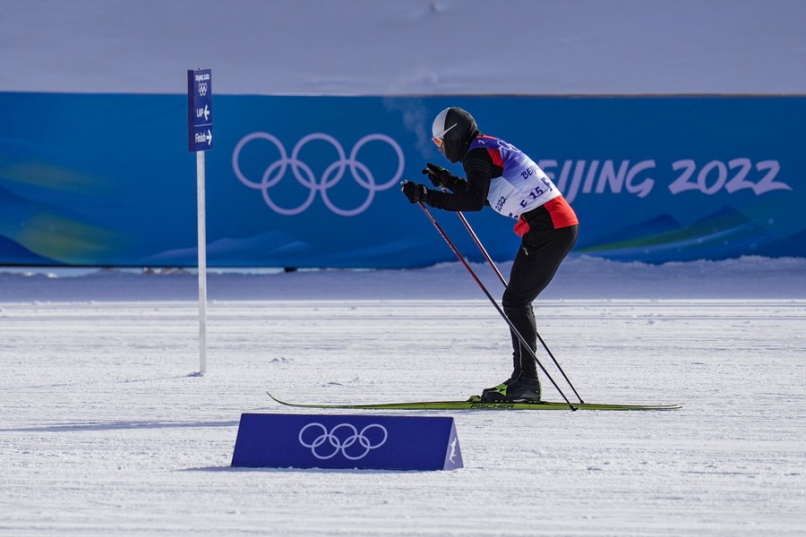 Torsongan Bullik (C) goes on a test run before the cross-country skiing men's 4x10 km relay of the Beijing Winter Olympics at National Cross-Country Skiing Centre in Zhangjiakou, north China's Hebei Province, Feb. 13, 2022. (Xinhua/Hu Huhu)
