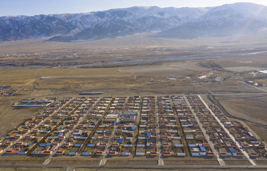 Aerial photo taken on Nov. 25, 2021 shows the hometown of Torsongan Bullik in Zalmute Township, Wenquan County, northwest China's Xinjiang Uygur Autonomous Region. (Xinhua/Hu Huhu)■