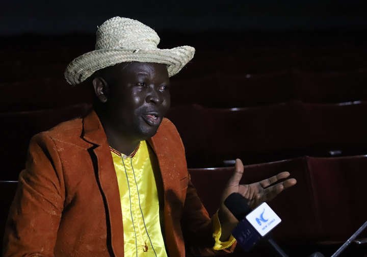 Troupe trainer John Bosco Katende speaks in an interview with Xinhua during a break in a recording session at the Uganda National Cultural Center (UNCC) in Kampala, Uganda, Feb. 10, 2022. (Xinhua/Zhang Gaiping)