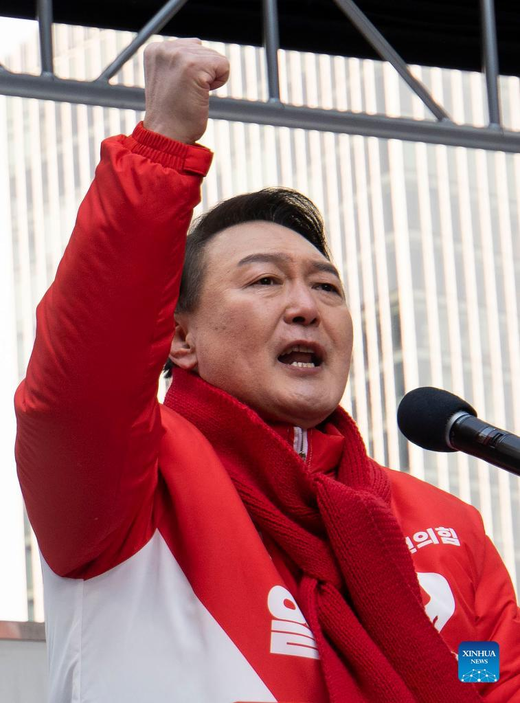 South Korean presidential candidate Yoon Suk-yeol (C) of the People Power Party attends a presidential election campaign in Seoul, South Korea, Feb. 15, 2022. South Korea's presidential election campaigning officially kicked off on Tuesday for a 22-day run ahead of the election to be held on March 9. (Photo by James Lee/Xinhua)