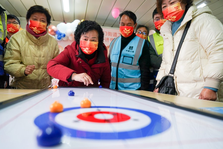 People play tabletop curling game to celebrate the upcoming Lantern Festival in Nanjing, east China's Jiangsu Province, Feb. 14, 2022. (Xinhua/Li Bo)
