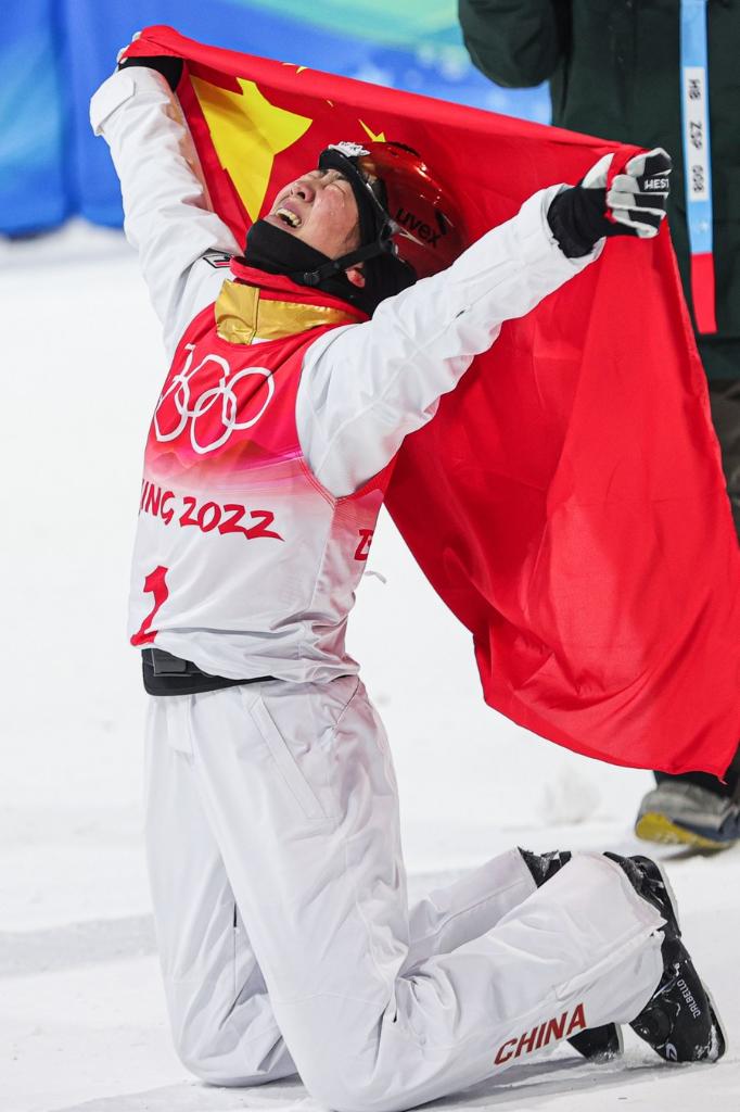 Xu Mengtao of China celebrates after the freestyle skiing women's aerials final of Beijing 2022 Winter Olympics at Genting Snow Park in Zhangjiakou, north China's Hebei Province, Feb. 14, 2022. (Xinhua/Wu Zhuang)